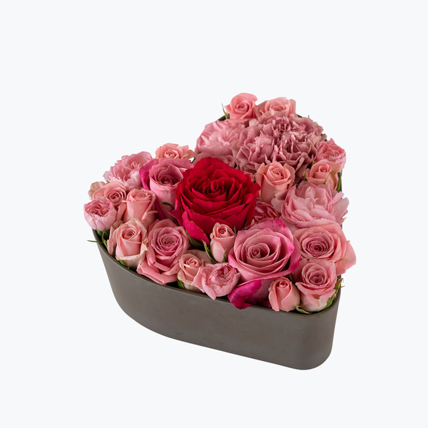Et vakkert hjerte fylt av nydelige roser er en populær gave å gi. Hjerteskålen er 17 cm, miljøvennlig og produsert av nedbrytbare gjenbruksmaterialer. Et godt valg rett og slett! En spesiell blomstrende hilsen til den du vil glede.